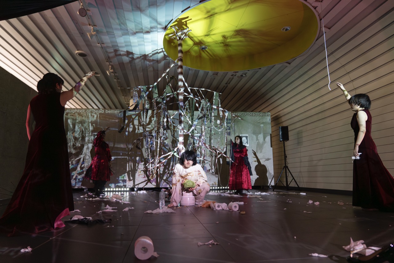 俳優の存在と呼応するリアルタイム演算を用いた映像演出、舞台と観客の境界を取り払う〈広場型〉の空間、そして画家 浦川大志氏が担う舞台美術。時代・空間・領域を越境し、観るものを巻き込む『ハムレットマシーン』をお届けします。